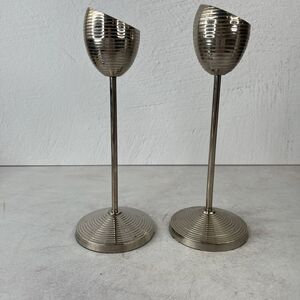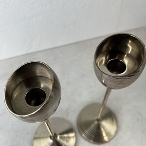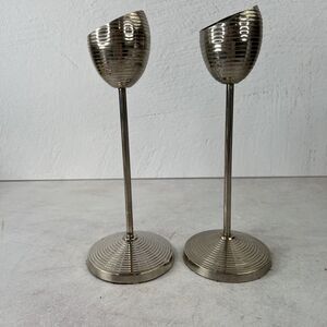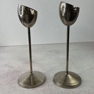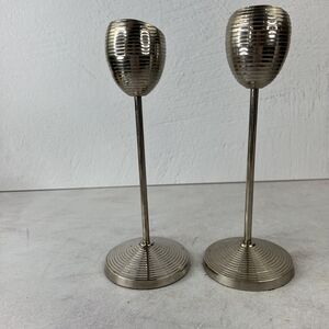 Vintage Retro Ribbed Metal Candle Stick Holders Set Of 2 9.25 In