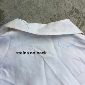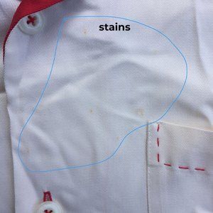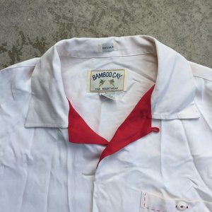 Ivory silk shirt with red accents. Chest 48". HPS to Hem 30". Has lots of stains, may wash out. Price reflects poor used condition.