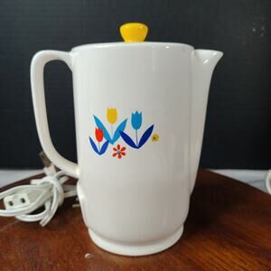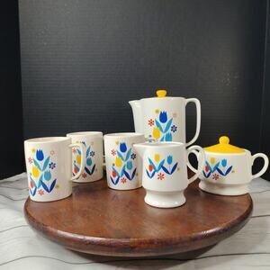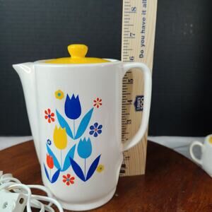 Vintage Retro Tulips Electric Teapot Set Cups Sugar Creamer. Made in Japan. SOLD AS IS. Please read description carefully.