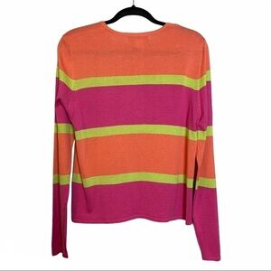 This Vintage Retro Feel Victoria Holley 70% silk and 30% Cotton cardigan has horizontal stripes of pink, green, orange, sherbet tone colors. Most of all the 2022/2023 trending colors in an always in style! It's very versatile and can be styled in so many ways. It truly is a piece you can add to your wardrobe and wear year round! Size 12 . Measurements are pit to pit 19 1/2” length 23 1/2” sleeve 26 1/2” (B102)