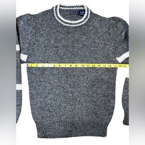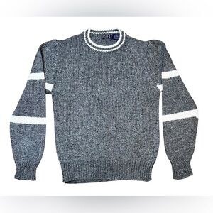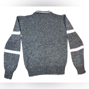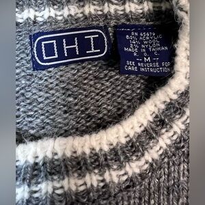 Women’s Medium Vintage OHI sweater with retro flair. This Crewneck Sweater has ribbed trim and is a pretty gray with white striped sleeves and trim. It is made of 84% Acrylic, 14% Wool, and 2% Nylon. So I really can’t tell if the tag says OHI or DHI. This sweater is in excellent condition. Perfect for vintage lovers or 80s–90s-inspired looks.
