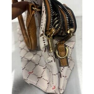 The Vintage 90s Y2K 2000s Purse Cat Pattern Baby Phat Small Arm Tote by Kimora Lee is a stylish and nostalgic handbag featuring a unique cat pattern design that embodies the Y2K and 90s fashion trends. Made of faux leather with silver hardware accents, this medium-sized tote has a zip closure and a camel-colored handle/strap, adding a touch of sophistication. The gold and buckle accents give it a chic and luxurious look, making it a perfect accessory for women looking to make a statement with a retro-inspired piece.