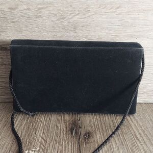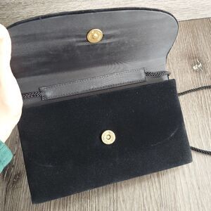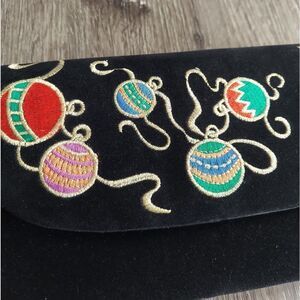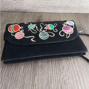 1980s / 1990s era vintage / retro Fancy That Embroidered Velvet Christmas Clutch Evening Purse. This black handbag features a gorgeous embroidered holiday design made up of a variety of colorful Christmas tree ornament balls. The metallic gold thread really makes it pop. This handbag converts from a crossbody type purse to a clutch simply by tucking the strap into the bag. There is a snap closure to keep the purse secure. It just screams retro style!