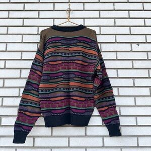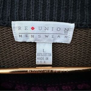 Bold and iconic vintage Reunion Menswear sweater featuring a rich 3D textured knit in deep earth tones—purple, rust, olive, forest green, and black—with a standout retro geometric pattern reminiscent of classic Coogi styles. 100% cotton, made in the USA, with a ribbed crewneck, cuffs, and hem. Size Large, unisex styling, excellent vintage condition with some expected light pilling (see photos). Cozy and eye-catching—perfect for fans of retro, statement knitwear, and 90s throwback aesthetics.