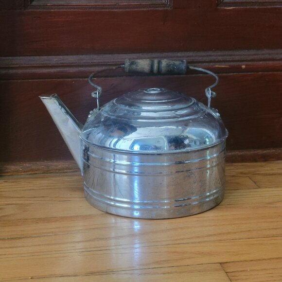 Classic vintage tea kettle with a lightweight aluminum body and a sturdy wooden handle. Functional and decorative for rustic or vintage decor.