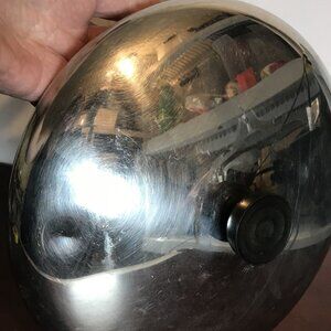 Some signs of use include minor scratches and patina on copper bottom. Top to bottom = 8 inches.
