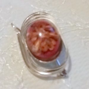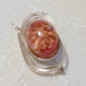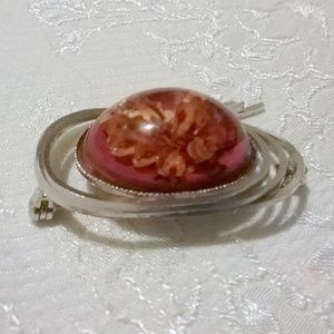 This lovely vintage brooch is done in a silver silver finish and is set with an amber colored reverse carved lucite center in which a flower is carved into. The brooch measures 1 3/4" in length by 1" in width. In beautiful condition!
