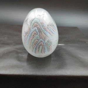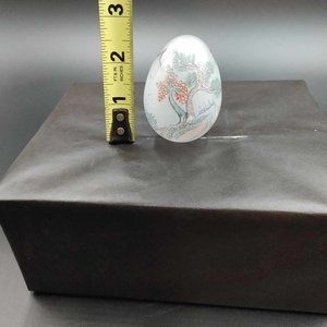 Vintage Revese Hand Painted Glass Egg with Asian Scene including mountains and tree. In Good condition with no cracks, chips or breaks. Measures approx. 2.5" tall. Does not include a stand.
