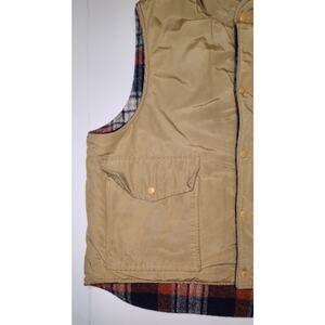 This vintage plaid vest is a must-have for any stylish gentleman. Made with a wool blend/nylon lining material, this vest is perfect for keeping you warm during the winter and fall seasons. The vest has a snap closure and is reversible, making it versatile for any occasion. In very good condition, some light marks on tan side, see photos for condition.