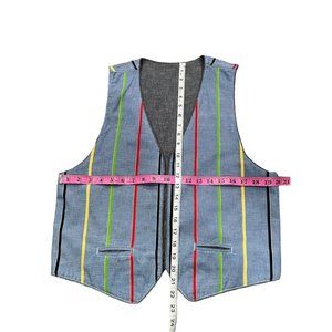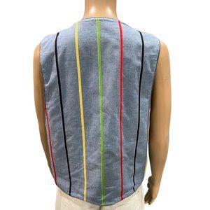 This vintage vest is in gently used vintage condition. One side is a solid chambray fabric, and the other features multi-colored stripes.