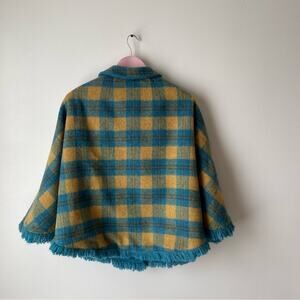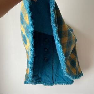 Adorable and super unique vintage collared gold/yellow and blue plaid poncho/shawl. It’s reversible and can be worn as solid blue as well. Buttons down the front. Fringe at the bottom edge. Feels like wool. Super warm. Excellent preowned condition. Has no tags, but it can fit multiple sizes since it’s a poncho and essentially just drapes over the body. See measurements in photos.