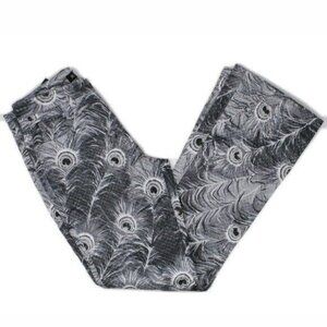 Women's vintage Revolt jeans in a peacock feather print with a slight flare.