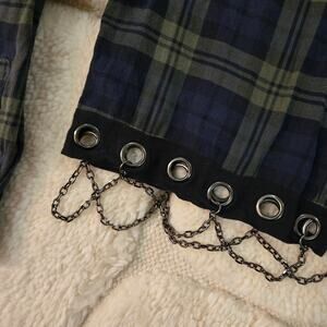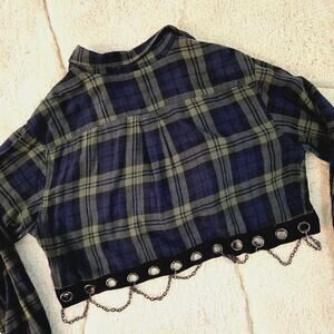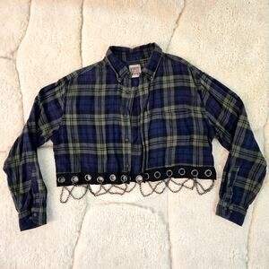 Comfy cropped vintage flannel by Furst of a Kind with grunge vibes. Navy and olive plaid with a classic flannel feel, reworked by hand to include chains and eyelets at the hem. Perfect to throw over your favorite tee or wear on its own! In excellent vintage condition. One size, fits like a Medium/Large for the perfect oversized fit. Paid $80 original price.