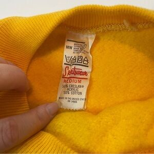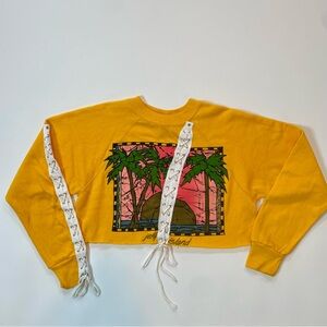 So cool vintage Jekyll Island destination sweater reworked with a cropped silhouette and lace up detailing. Bright gold color with sick tropical graphic. Sporty lace up detailing on the front and right arm. Made in USA, brand is Sportswear. Acrylic and cotton. Size M