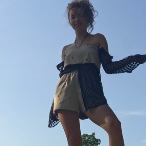 polka dot lady set β₯οΈπ€ beige embroidered lady bug print tube top with matching shorts ~ added on sheer black polka dot reversed dress sleeves