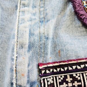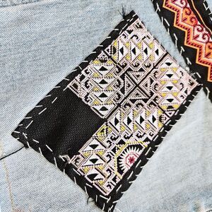 Handcrafted Upcycled Timberland Denim Skirt – Stitched Boho Patchwork Jean Skirt with Textile Accents. Converted from a vintage pair of Timberland jeans. Fringe detail along the pockets with neatly stitched textiles patches throughout. The original jeans had some discoloration. I personally think it adds to the piece. Converted from a size 34 jeans. Based on the measurements, I estimate these to be closest to a modern size 12.