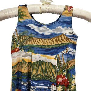 Sleeveless pleated sun dress with a multicolor tropical beach, ocean, flower, beach goers & volcanos pattern. 100% Spun Rayon. Tailored in Hawaii. Vintage, retro, Hawaii, Hawaiian, aloha, party, vacation, travel, beach, sundress