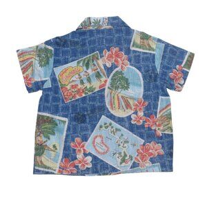 Great Hawaiian shirt from Reyn Spooner! Blue tones with fun tropical print. Center front buttons. Cotton blend. Size 4T. Excellent condition.