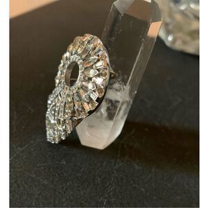 Rhinestones are well faceted and set in prongs or embedded in various shapes/sizes as Marquis, Emerald and Round in a circular and cascading pattern