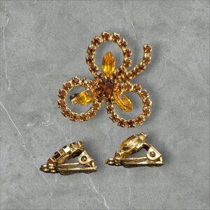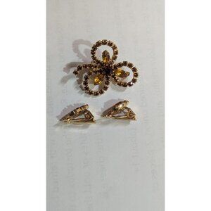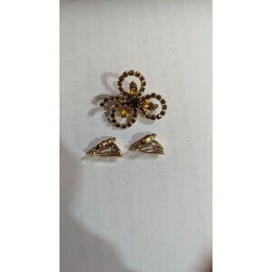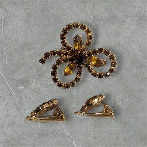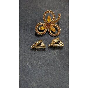 Vintage Rhinestone Bow Brooch & Clip-On Earring Gold tone topaz brown tone