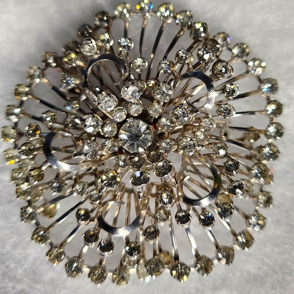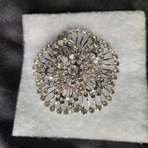 Silver, Rhinestone Brooch. Vintage. Good Condition. Minor Wear in the back. 2.5 inches in diameter. Very Shiny! Loved this piece, but need to make room in my closet!