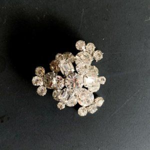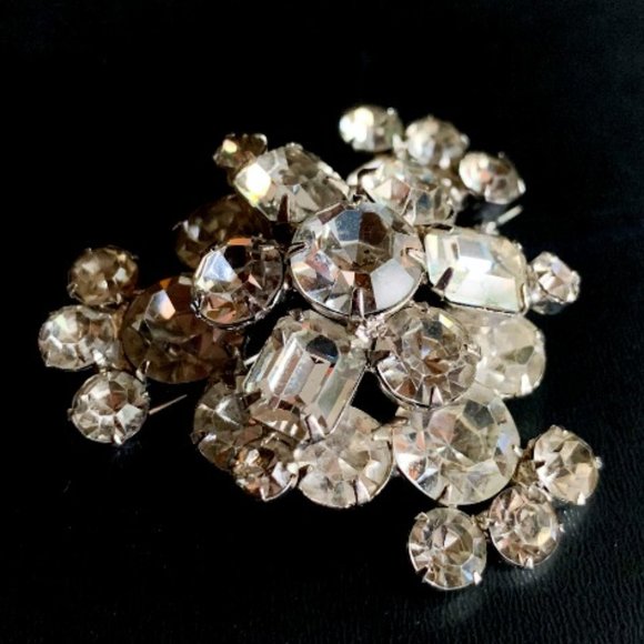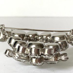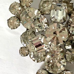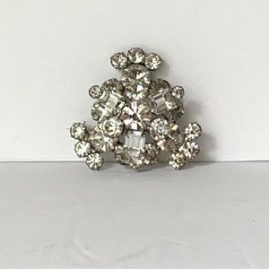 Vintage large triangular shaped brooch with multiple shaped/sized faceted rhinestones prong set with good clarity/color in a silver tone setting. This is in excellent vintage condition. The back pin does have a slight bend (seen in photos).