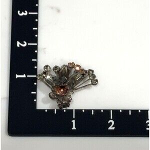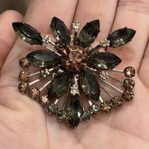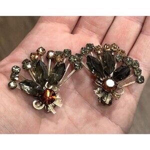 Vintage rhinestone brooch and matching clip-on earrings set in a gold tone metal. Features smoky green gray and amber tone rhinestones arranged in a fan and floral burst design. Unmarked but well-made mid-century construction with riveted settings.
