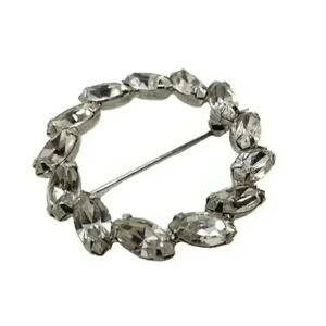 Vintage Rhinestone Brooch Faceted Leaves Wreath Circle Rhodium Plate Statement