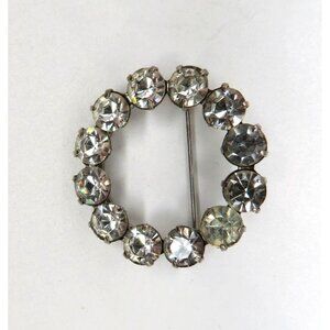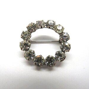 This vintage brooch features a circle of rhinestones set in silver tone. The clear crystals add a touch of elegance to any attire, making it a timeless accessory. Preowned - one rhinestone has yellowed - see photo