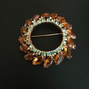 Well made vintage circle pin features an outer row of topaz navettes encircling an inner row of green aurora borealis rhinestones, all prong set into shiny gold tone metal.
