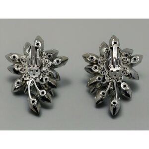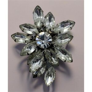 Make a dazzling statement with these stunning vintage rhinestone clip-on earrings. Featuring a radiant floral-inspired design, these earrings are crafted with clear, marquise-cut rhinestones, elegantly arranged in a layered cluster. At the center of each earring is a brilliant round rhinestone that catches the light beautifully, adding extra sparkle to any ensemble.
