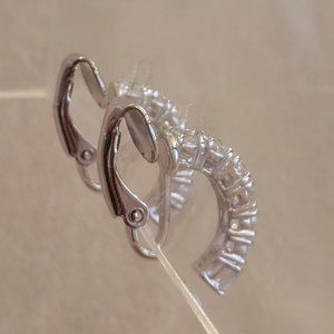 Vintage Rhinestone Clip-on Earrings with seven square-cut clear rhinestones in a prong setting mounted on a silver-tone back which attaches to the earlobe with a clip.