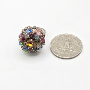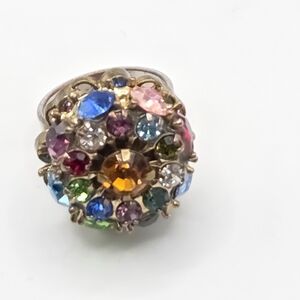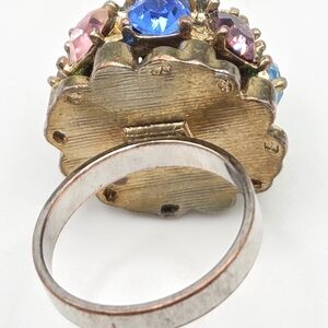 This amazing vintage ring is a size 5 1/2 and features multicolor rhinestones set on a gold-tone base and silver-toned band. The metal is non-magnetic so I believe it may be brass. The workmanship on the top of the ring is amazing and the rhinestones are bright and sparkly.