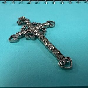 Elegant cross pendant with sparkling rhinestones. Intricate heart details on each end. Perfect for adding a touch of vintage charm.