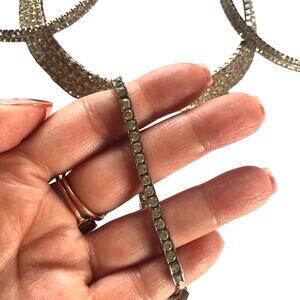 Set of 3 pieces that can be worn together or separately. The bib necklace is slightly adjustable. Rhinestone large hoop earrings. Rhinestone single adjustable tennis bracelet.