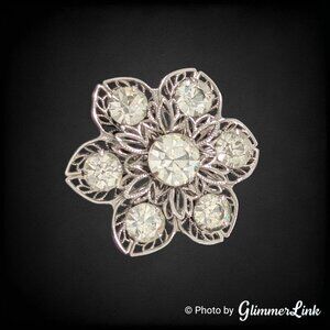 Vintage Rhinestone Flower Brooch Silver Tone Filigree Pin - Clear Sparkly Stones