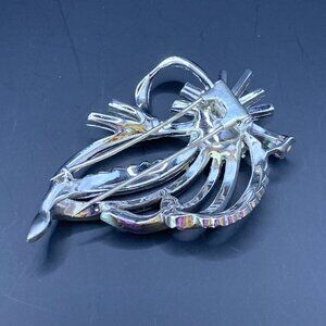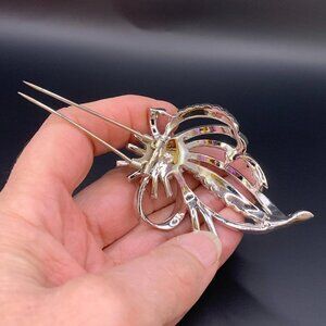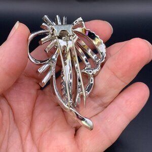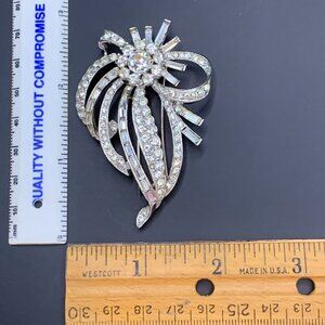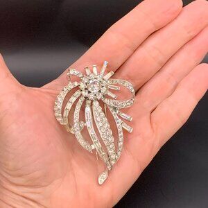 This piece is absolutely gorgeous! This is a fur clip that can easily be worn as a brooch. The rhinestones are just gorgeous. There is one stone that looks dark. This sometimes happens from age. See the last picture. This pin is just the epitome of old Hollywood glamour. Measures 2-11/16" by 1-11/16"