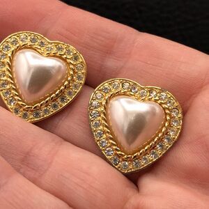 Vintage Rhinestone Heart Earrings Faux Pearl Gold Tone Posts 80s 90s Signed JS