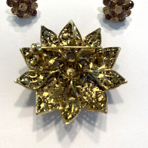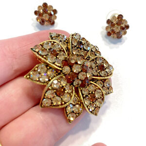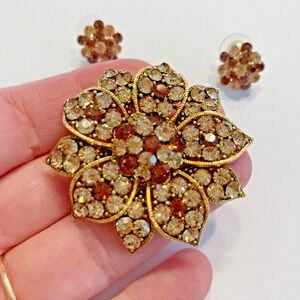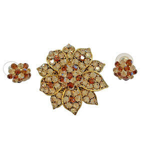 Vintage Mid Century Rhinestone Jewelry Set - stunning brooch with pendant loop & pierced earrings done in goldtone metal settings covered with sparkling clear white and deep coppery colored round rhinestones. The brooch is shaped in a dimensional floral design with domed center - the earrings are small rounds that mimic the flower center. No hallmarks but nice quality fashion jewelry. In excellent vintage condition - minor surface wear - no damage or flaws - so pretty and totally giftable!
