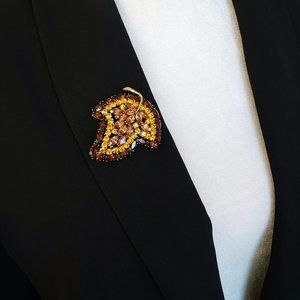 Leaf brooch and earring set features both light and dark topaz rhinestones, along with orange citrine colored rhinestones, all prong set into shiny gold tone metal.