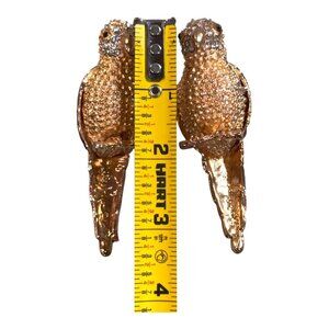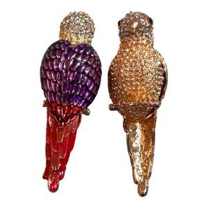These stunning vintage parrot showcase meticulous craftsmanship with brilliant rhinestone-encrusted bodies and vibrant enamel wings. The dimensional design captures the majestic essence of tropical birds, while the gold-tone finish adds timeless elegance to any ensemble.