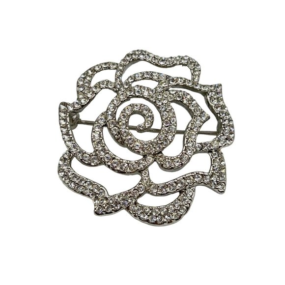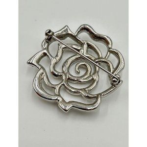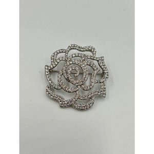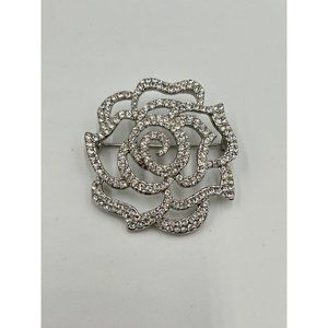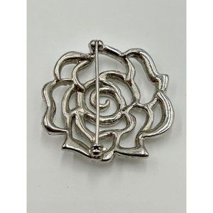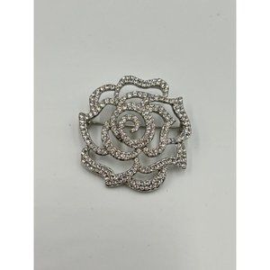 Vintage Rhinestone Pave Rose Flower Pin Brooch Silver Tone Metal Openwork Design