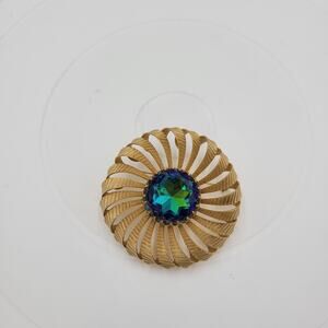 Gold Tone Pinwheel Statement Brooch Pin Iridescent Bue Green Rhinestone