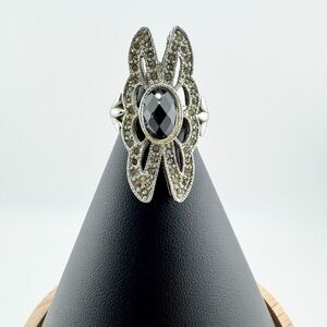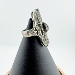 Add a touch of whimsy to your outfit with this vintage black & clear rhinestone ring! This ring is a statement piece that exudes retro charm. The intricate design with sparkling rhinestones adds a dash of elegance to your look. Perfect for adding a pop of color and personality to any ensemble, this ring is a must-have for fashion-forward individuals with a love for vintage style.