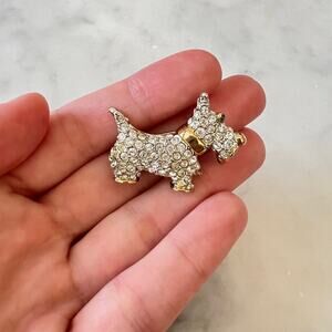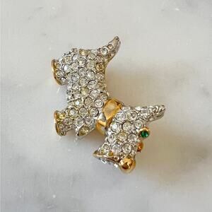 Vintage rhinestone Scottish Terrier brooch. Clear rhinestones in a gold tone setting. One green rhinestone eye. Rotating c-clasp closure. So cute and pretty! Measures about 1.5" across by just over 1" high. In very good vintage condition.