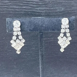 vintage jewelry, rhinestone earrings, chandelier earrings, screw back earrings, mid century, 1950s jewelry, silver tone, bridal accessories, cocktail, statement earrings, old hollywood, baguette rhinestones, adjustable earrings, non pierced earrings