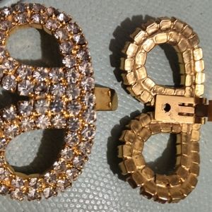 Brilliant rhinestones set in gold tone metal will transform plain pumps into Cinderella slippers. Each attaches with a secure clip, measuring 2" wide by 1.5" high. Unsigned.