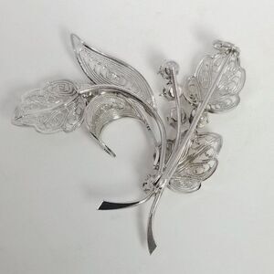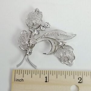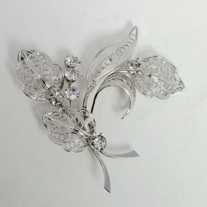 Vintage Rhinestone Silver Tone Filigree Leaf Shape Brooch, Prong Set Lapel Pin
