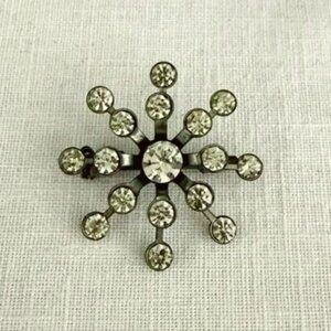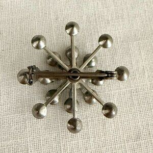 glam, retro, vintage brooch, rhinestone pin, starburst design, silver tone, elegant jewelry, collectible accessory, formal wear, classic embellishment, retro style, timeless appeal, sparkling details, secure clasp, fashion statement