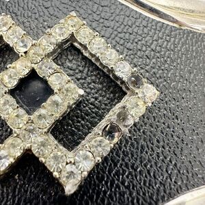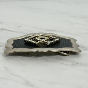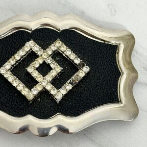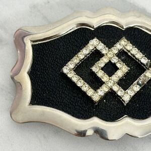 Gorgeous vintage belt buckle with such classic appeal! Features a stunning geometric diamond pattern in rhinestones set against a black textured background with a beautiful scalloped silver tone frame. Made in USA quality!